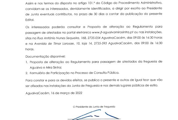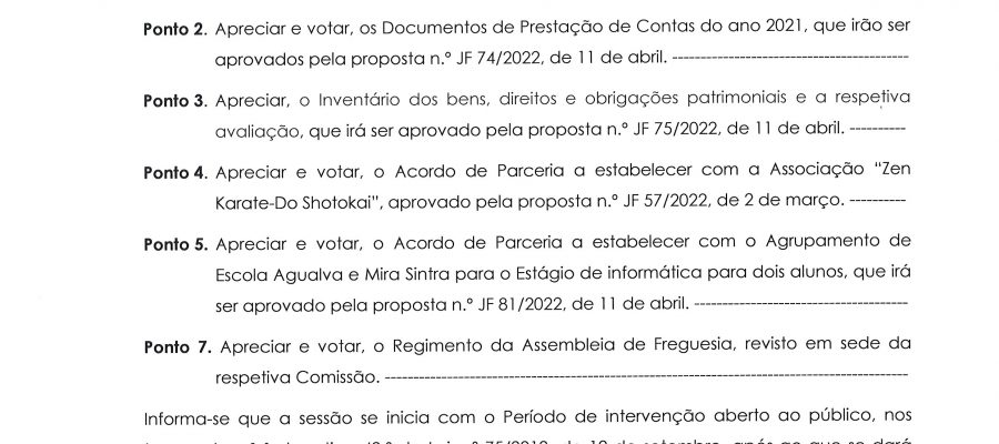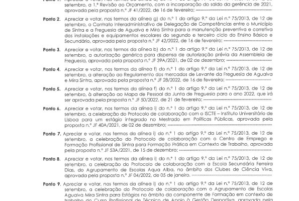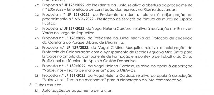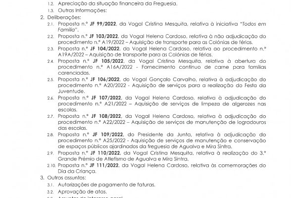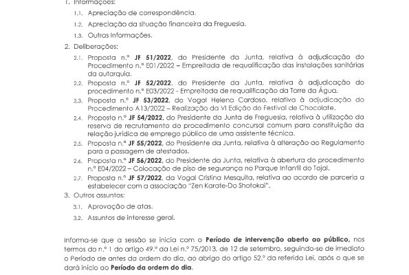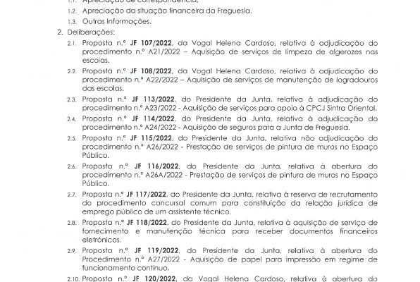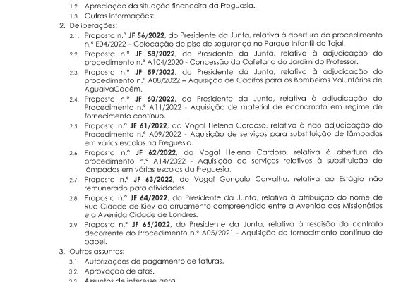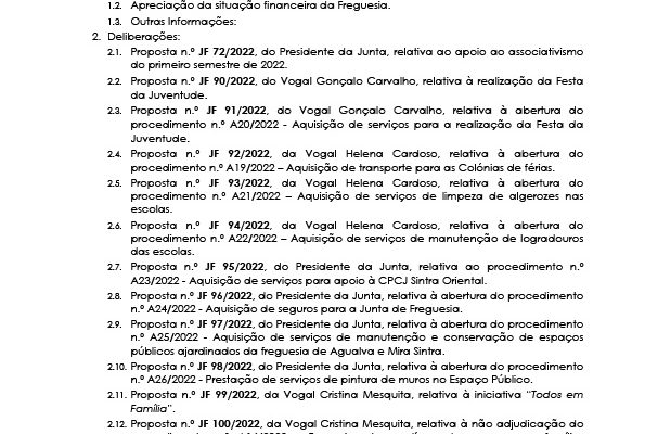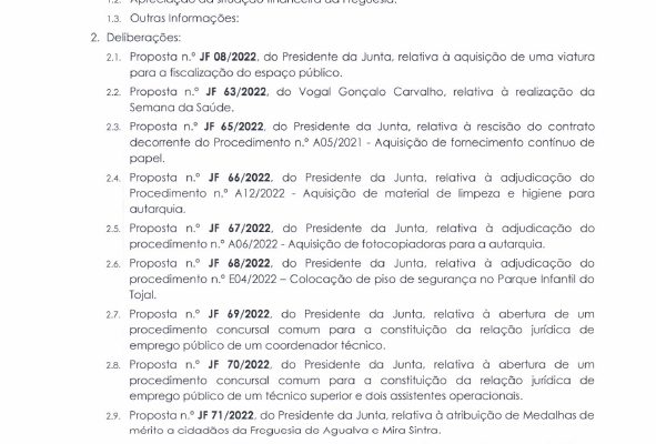Carlos Miguel Nunes Casimiro Pereira, Presidente da Junta de Freguesia da União das Freguesias de Agualva e Mira Sintra, nos termos do artigo 20.º da Lei n.º 75/2013, de 12 de setembro, e considerando a Proposta n.º JF 50A/2021, de 15 de dezembro, relativa às reuniões da Junta de Freguesia… Read more »