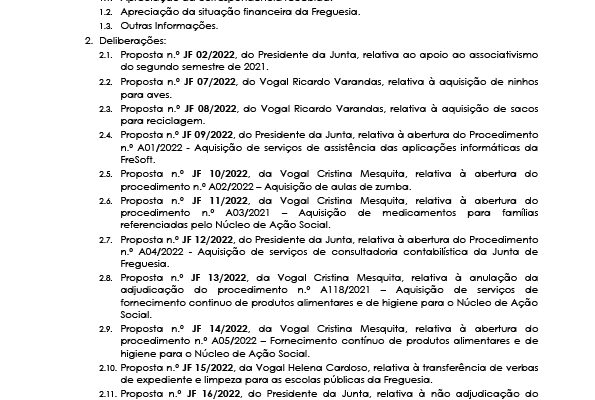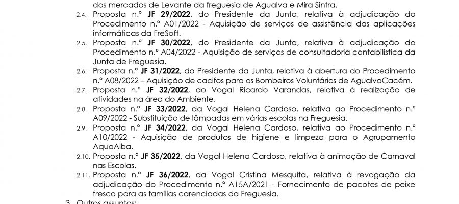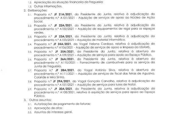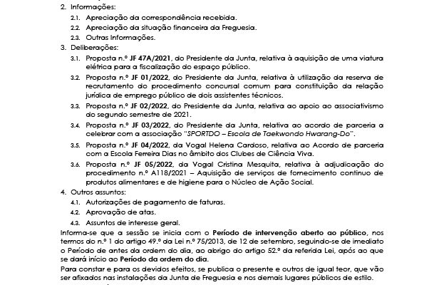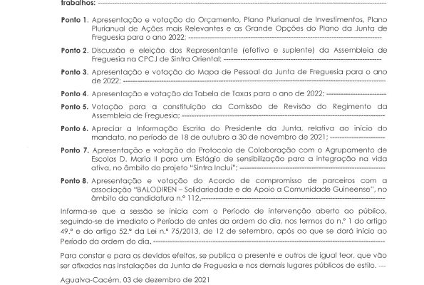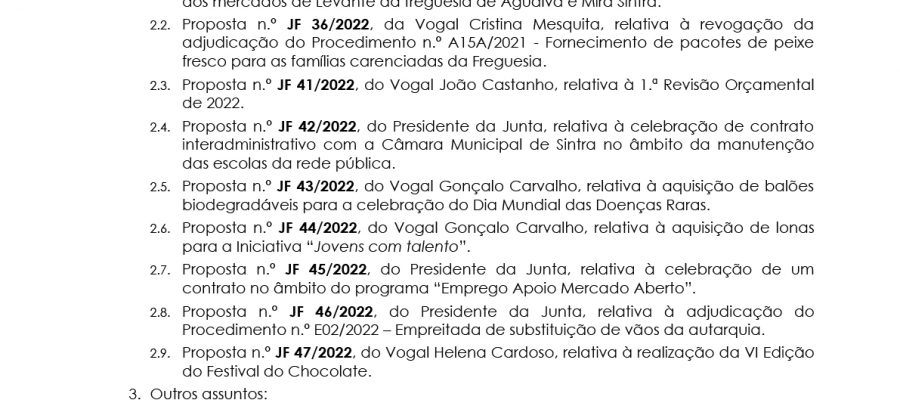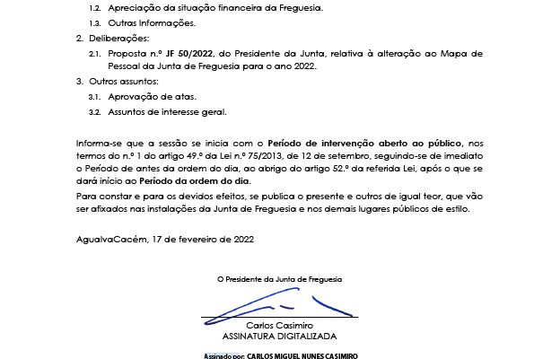 Carlos Miguel Nunes Casimiro Pereira, Presidente da Junta de Freguesia da União das Freguesias de Agualva e Mira Sintra, nos termos do artigo 20.º da Lei n.º 75/2013, de 12 de setembro, torna pública a realização da reunião extraordinária da Junta de Freguesia, no próximo dia 21 de fevereiro de… Read more »