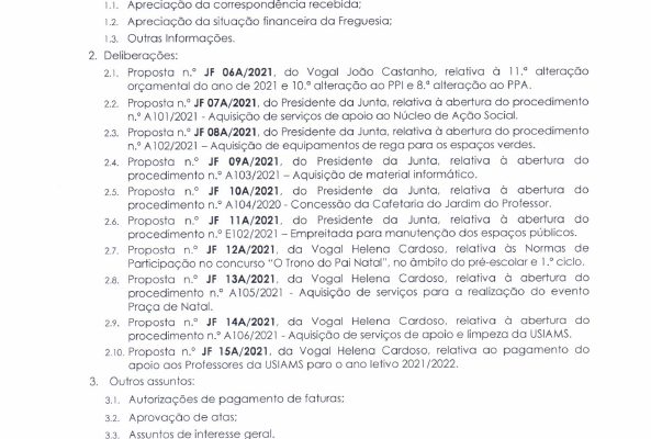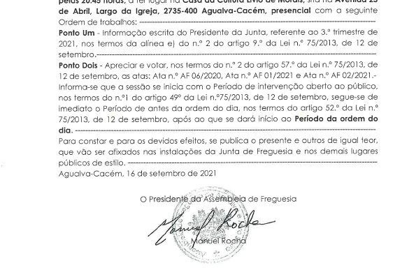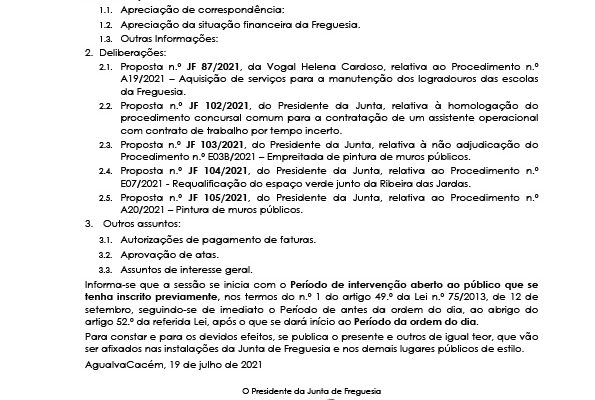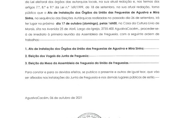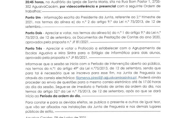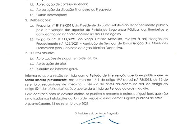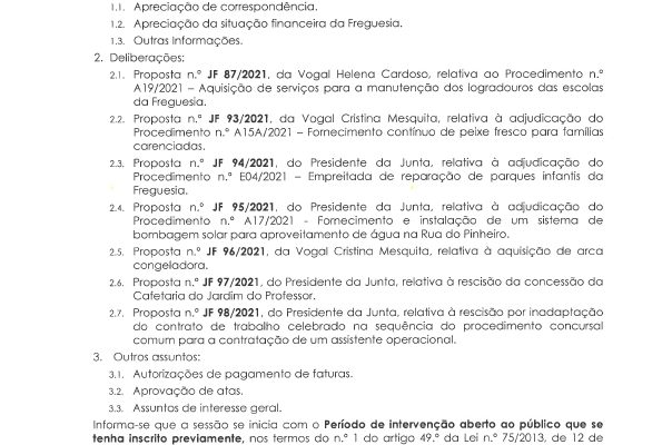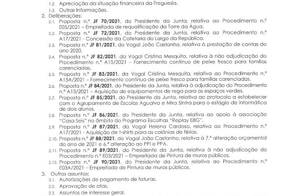 Carlos Miguel Nunes Casimiro Pereira, Presidente da Junta de Freguesia da União das Freguesias de Agualva e Mira Sintra, nos termos do artigo 20.º da Lei n.º 75/2013, de 12 de setembro, e considerando a Proposta n.º JF 04A/2021, de 21 de outubro, relativa às reuniões da Junta de Freguesia… Read more »