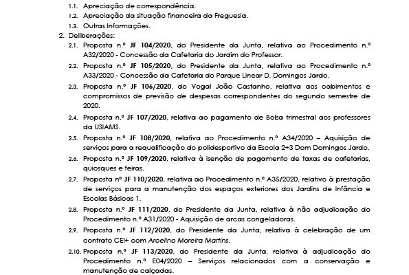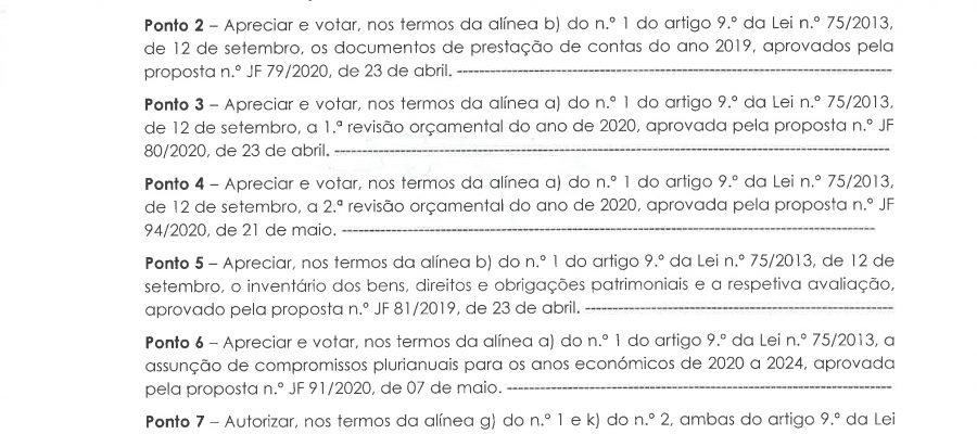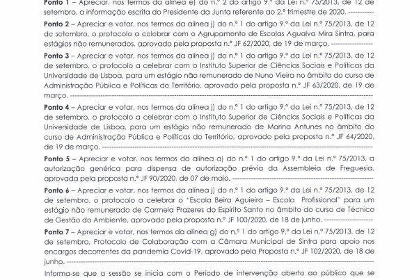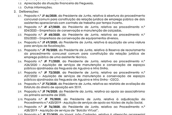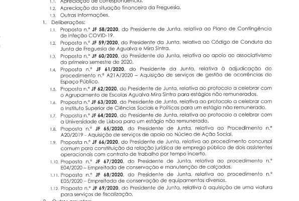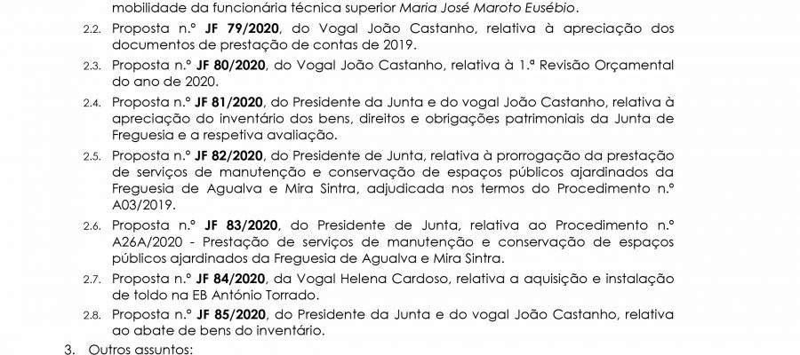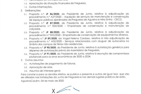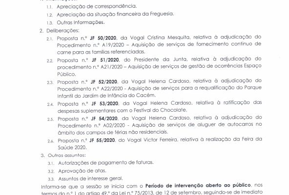 Carlos Miguel Nunes Casimiro Pereira, Presidente da Junta de Freguesia da União das Freguesias de Agualva e Mira Sintra, nos termos do artigo 20.º da Lei n.º 75/2013, de 12 de setembro, e considerando a Proposta n.º JF 192/2019, de 19 de dezembro, relativa ás reuniões da Junta de Freguesia… Read more »