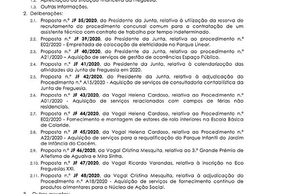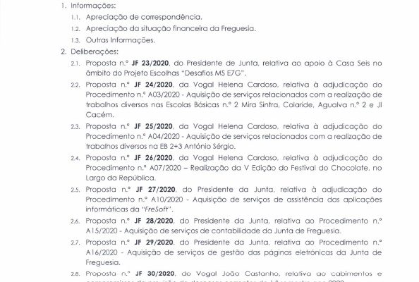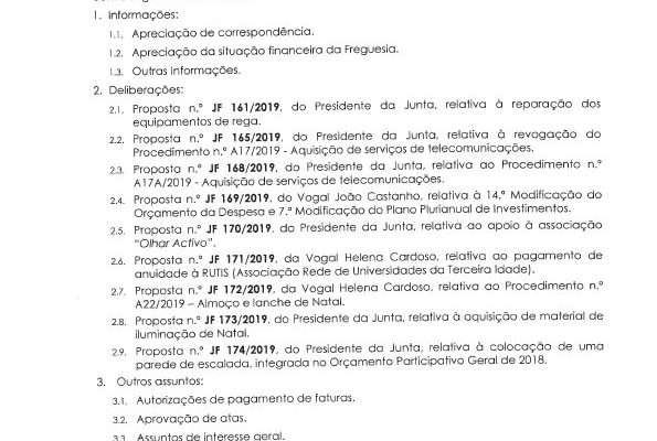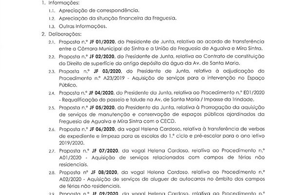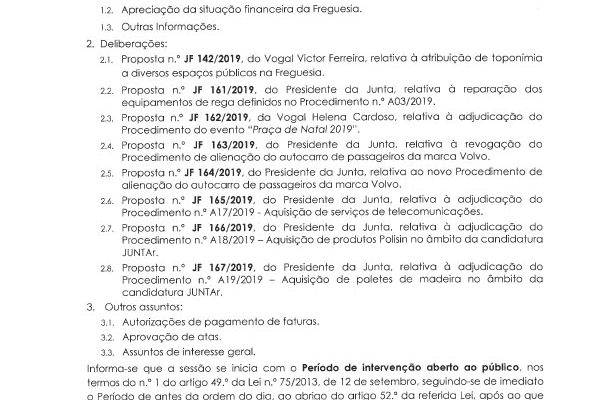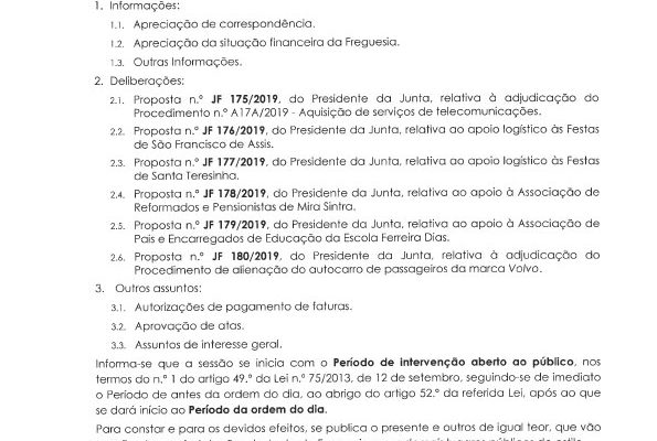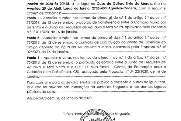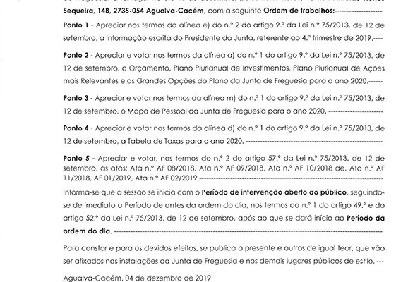 Carlos Miguel Nunes Casimiro Pereira, Presidente da Junta de Freguesia da União das Freguesias de Agualva e Mira Sintra, nos termos do artigo 20.º da Lei n.º 75/2013, de 12 de setembro, e considerando a Proposta n.º JF 192/2019, de 19 de dezembro, relativa ás reuniões da Junta de Freguesia… Read more »